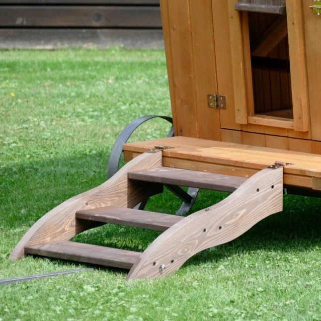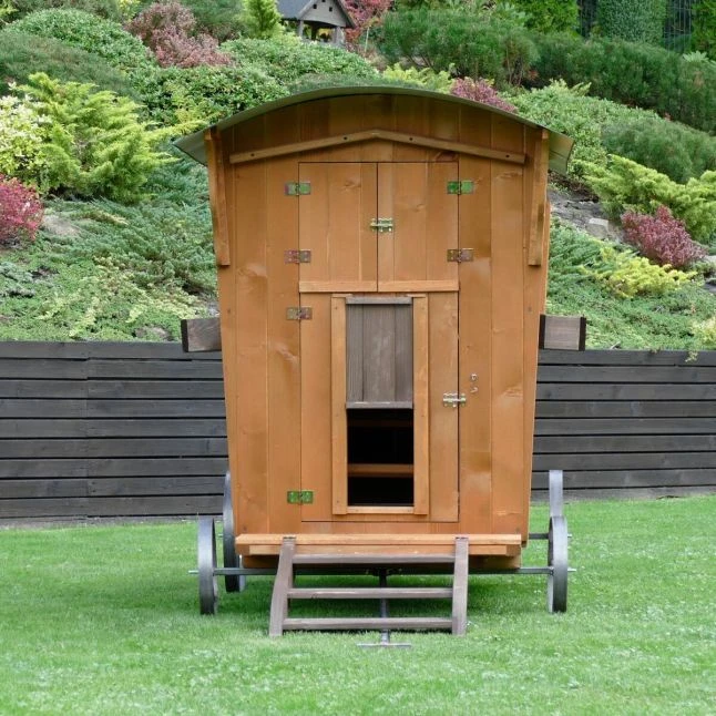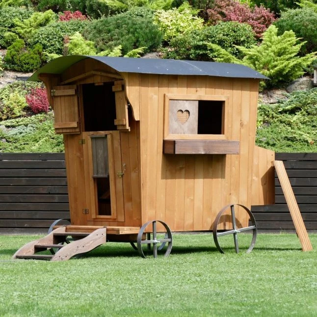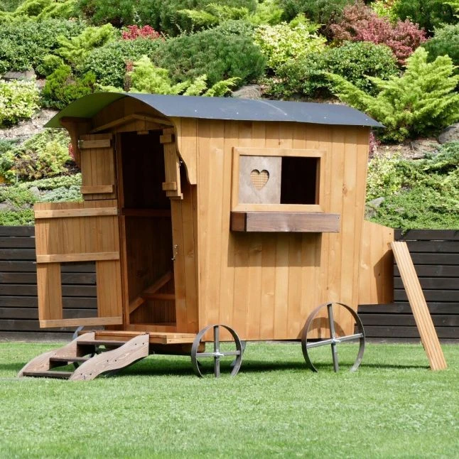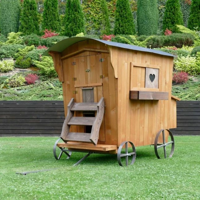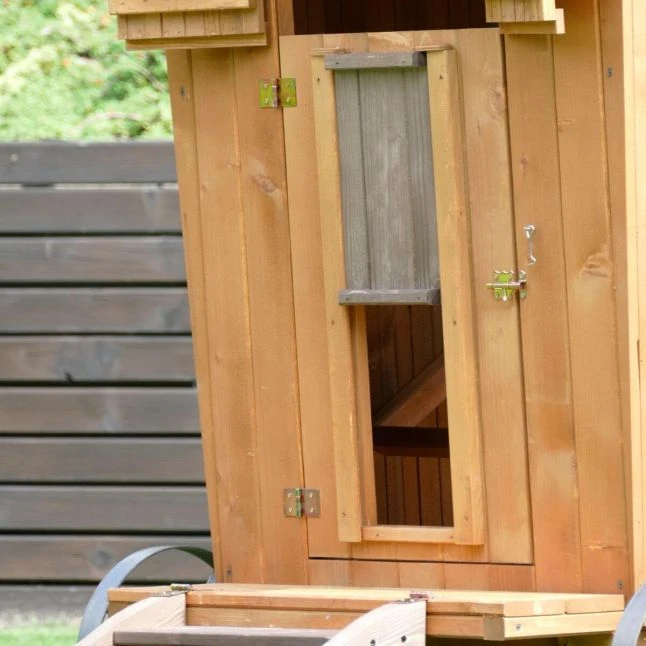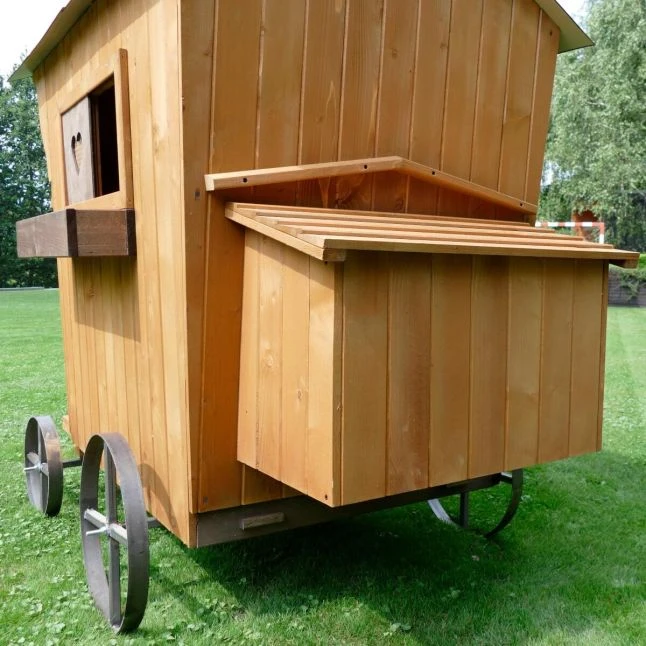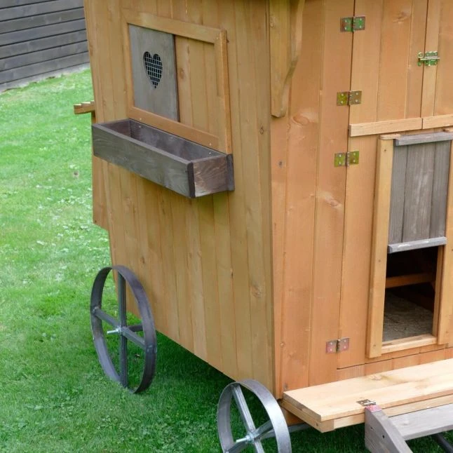Cette petite roulotte conçue en Europe a été pensée spécialement pour accueillir vos oiseaux de basse-cour. Les matériaux sont solides, il s’agit de bois épais provenant de forêts européennes et de parties en métal résistantes.