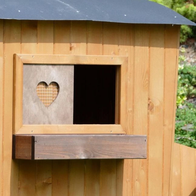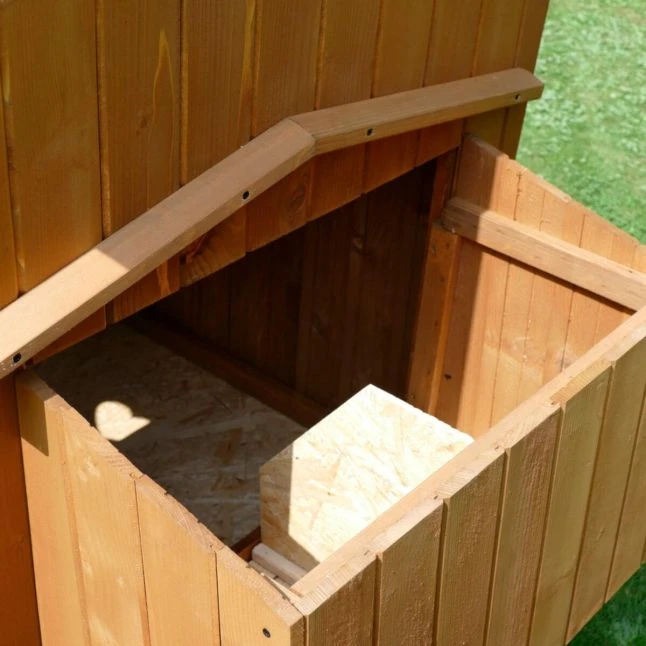 Le pondoir divisé en deux parties est placé à l’arrière et accessible depuis l’extérieur grâce à sa toiture séparée. Ce qui sera bien pratique pour aller récolter les œufs fraichement pondus.