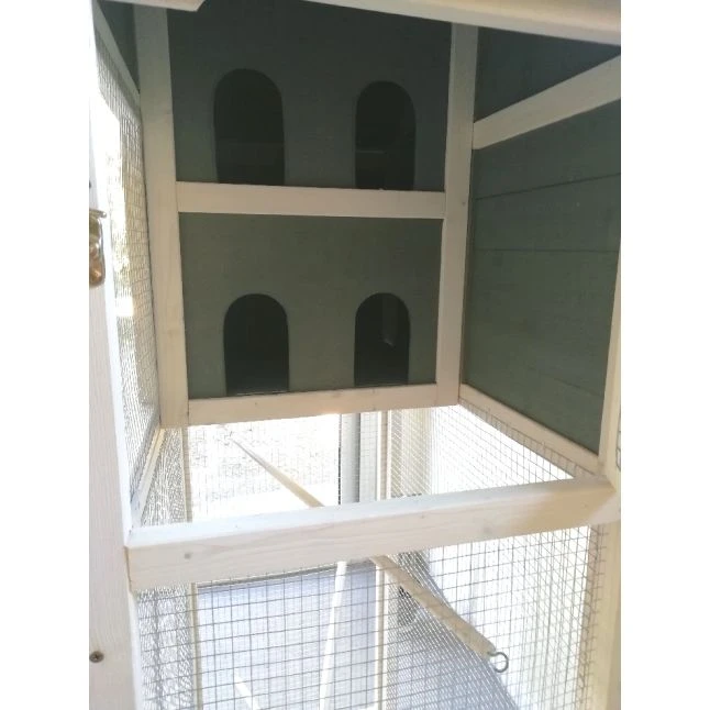 Elle se compose d’un enclos grillagé aux dimensions importantes et d’une partie nuit placée en hauteur. L’ensemble offrira un bel espace de vie à vos oiseaux.